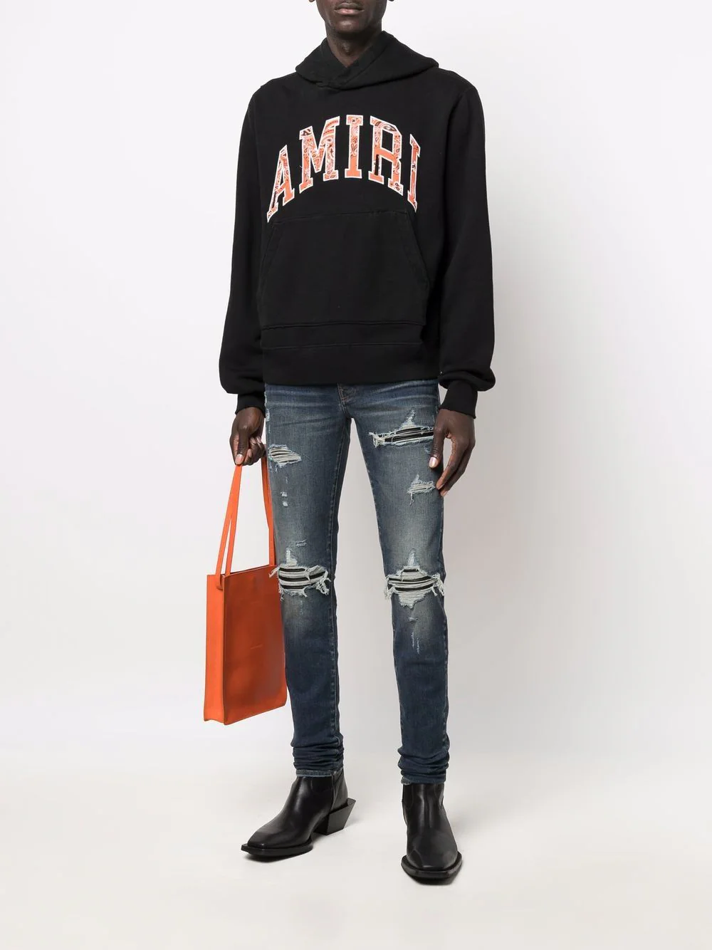 Indigo blue cotton blend distressed skinny fit jeans from AMIRI featuring ripped detailing, low-rise, belt loops, classic five pockets and skinny cut.