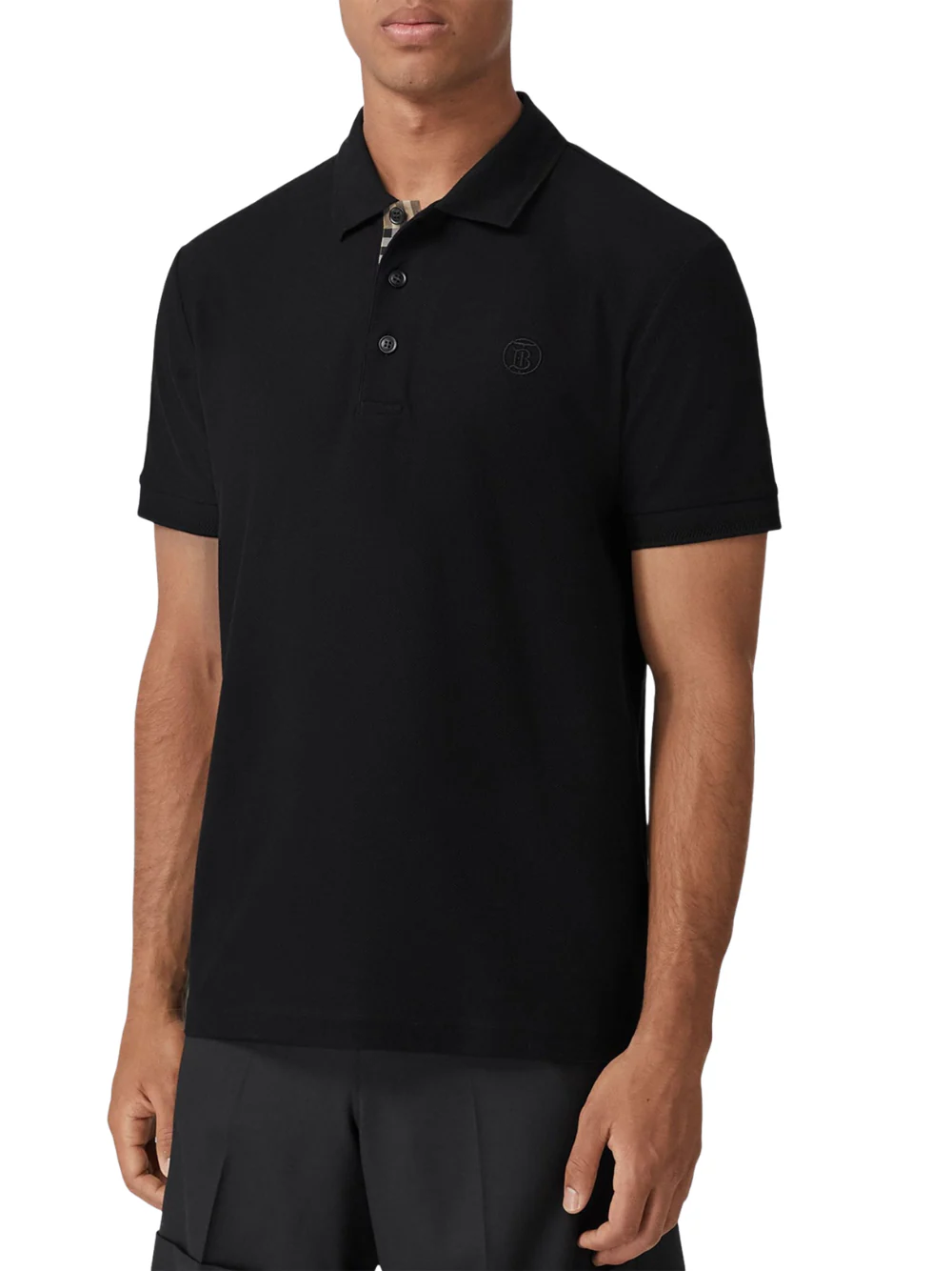 Elevated by Burberry's signature Vintage check placket, this black polo shirt is crafted from piqué cotton for a lightly textured finish. A tonal embroidered TB Monogram is embroidered at the chest alongside the signature button placket completes the casual luxury design.