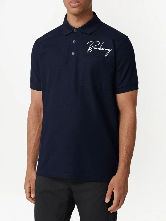 Logo-embroidered oversized polo shirt from BURBERRY featuring midnight blue, cotton, piqué weave, embroidered logo at the chest, polo collar, front button placket, short sleeves, chest patch pocket, side slits and high-low hem.
